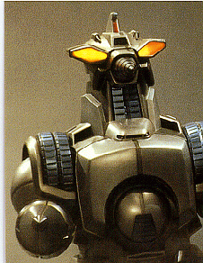 Powers/weapons: Plasma laser cannons in eyes, a plasma maser cannon projector in chest plate, spiral grenade missiles in robots hands, rotating drill for nose. Flight jets in feet and tail propel it at Mach 1 on Earth, Mach 44 in space. Can move on treads or with independent leg action. Can separate into flying Star Falcon (80 meters/ 262 feet; 70,000 metric tons/77,000 tons;flies at Mach 35) and a burrowing Land Moguera (85 meters/279 feet; 90,000 metric tons/ 99,000 tons).